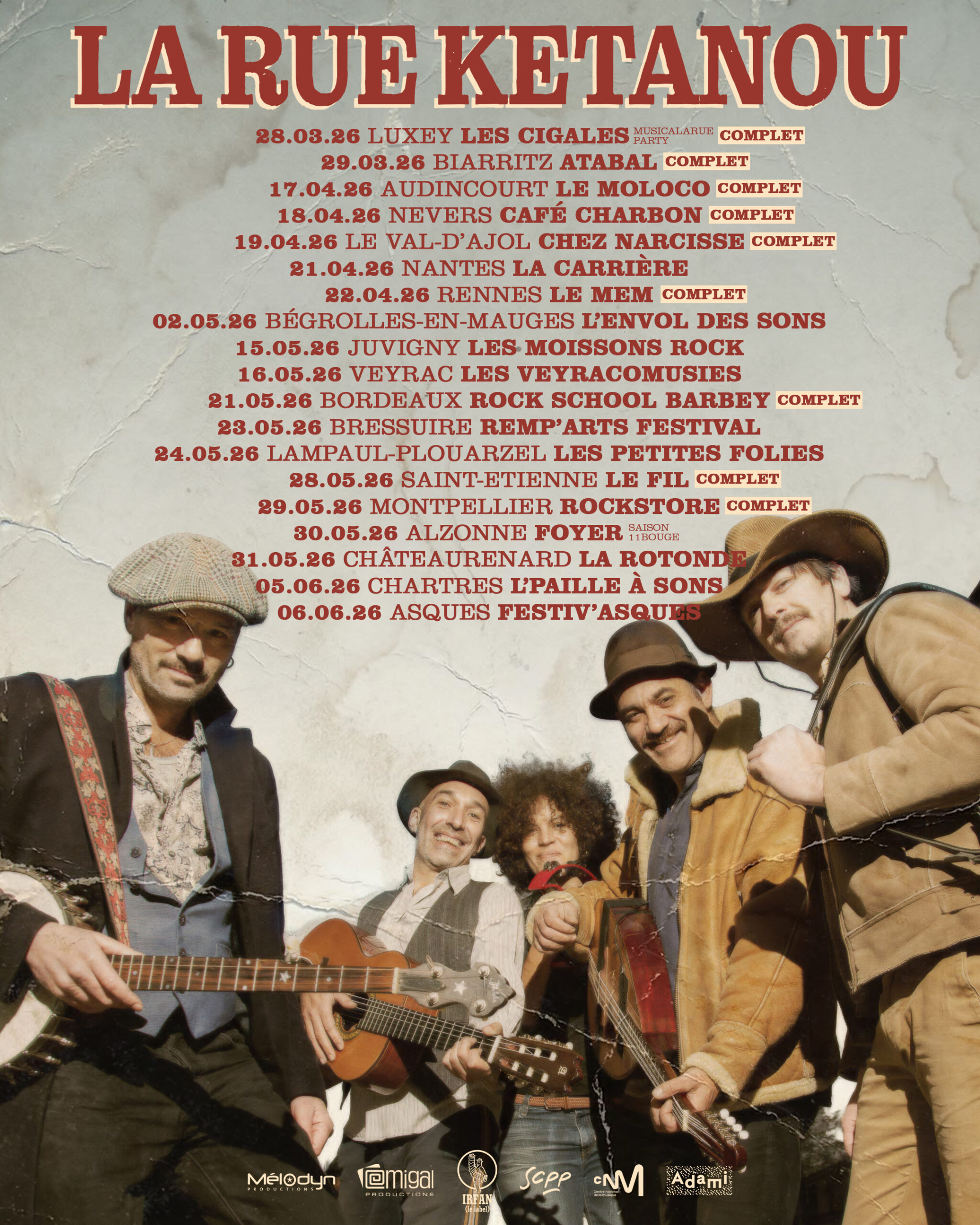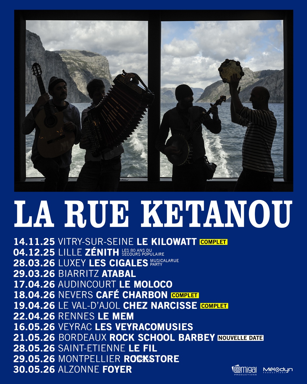 Ils sont des centaines, des milliers aux concerts de La Rue Ketanou. Des centaines, des milliers, des fidèles, des avertis, des curieux, des convertis. Toujours disponibles pour les retrouvailles. Toujours prêts à marcher dans les refrains et les vers émancipés. Et tout est là, dans cette histoire que raconte ce groupe et le public, dans ce partage complice qui continue de jouer les prolongations depuis plus de deux décennies. Un groupe reconnu et respecté pour son esthétique et sa probité. Liberté de ton. Liberté d'inspiration. Liberté de temps aussi. Six ans de silence discographique depuis le dernier signal Allons voir. Mais on ne lâche jamais une cordée chez La Rue Ketanou, on s'y attache. Parfois, on la détend juste dans le but de satisfaire d'autres élans, d'ouvrir d'autres portes, d'expérimenter d'autres transmissions. Ils sont comme ça, ces garçons-là, fantasques, aventureux, à multiples détentes. On aura donc vu Florent Vintrignier monter la Green Box, projet mêlant les poèmes de Victor Hugo et la folk des grand espaces, et s'avérer un solide allié dans le bel envol de la chanteuse franco-suédoise Eskelina (Prix Moustaki 2016). L'hyperactif Mourad Musset aura, pour sa part, ajouté un chapitre supplémentaire à Mon Côté Punk, gagné les rangs des forces vives du Collectif 13, rayonné dans le sensible film de Fabienne Godet (Nos vies formidables) et foulé les planches dans une pièce de Lazare (Sombre rivière). Pièce dans laquelle il a retrouvé son comparse Olivier Leite, également à l'affiche d'une autre œuvre du même auteur-metteur en scène (Je m'appelle Ismaël). Et puis il y a eu des divines surprises comme cette poignée de concerts en 2018 pour célébrer l'anniversaire des 20 ans ainsi qu'une adoption. La famille s'agrandit. La Rue Ketanou n'est plus trio mais quatuor. Le nouvel enfant du désordre s'appelle Pierre Luquet, et lui aussi a fricoté avec le Théâtre du Fil, point de connexion faut-il le rappeler des trois funambules d'origine. Appelé sur une date d'été pour suppléer un Florent Vintrignier - diminué par une tendinite à la main - sur les morceaux à tempo rapide, il n'a finalement jamais plié bagages.